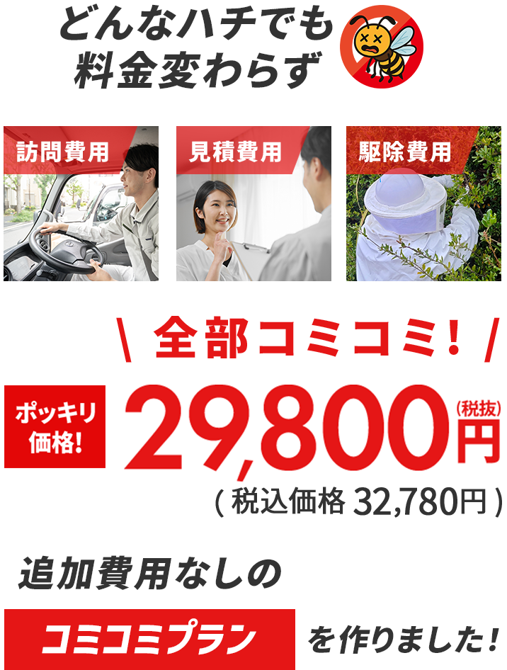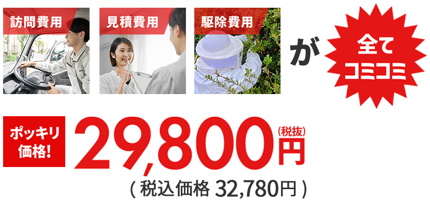 はい。訪問費用、作業費用すべて込みで29,800円(税込32,780円)となります。追加費用などはございません。但し、対応範囲を超えた危険作業や特殊作業などが発生する場合は、別途見積になることがございますので、コールセンターまでご相談ください。